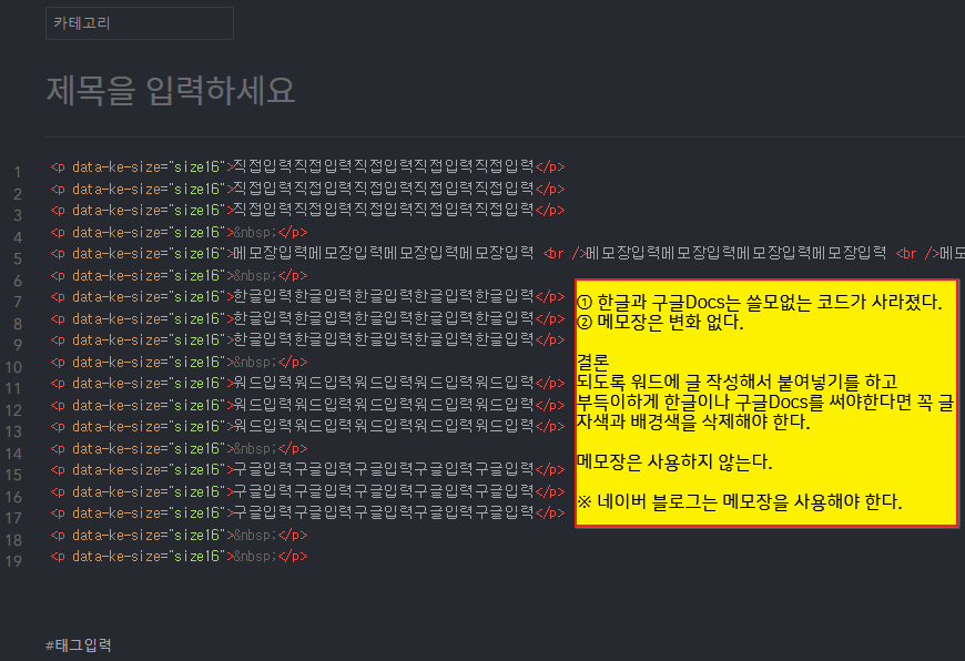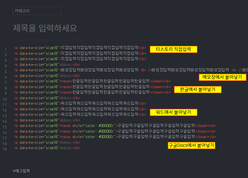 ② 아래 이미지와 같이 메모장에서 붙여넣기를 한 경우를 제외하곤 모두 티스토리에 직접 입력한 글처럼 쓸모없는 코드가 사라졌다.
