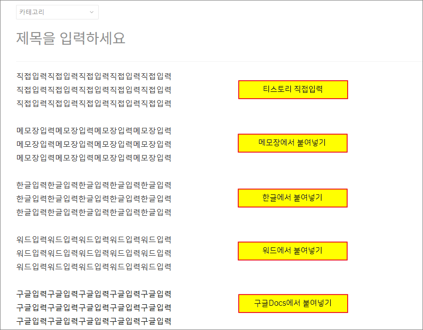 ① 아래 이미지와 같이 티스토리에 직접 입력하고, 메모장, 한글, 워드, 구글Docs에서 글을 작성하고 티스토리에 붙여넣기를 했다.
