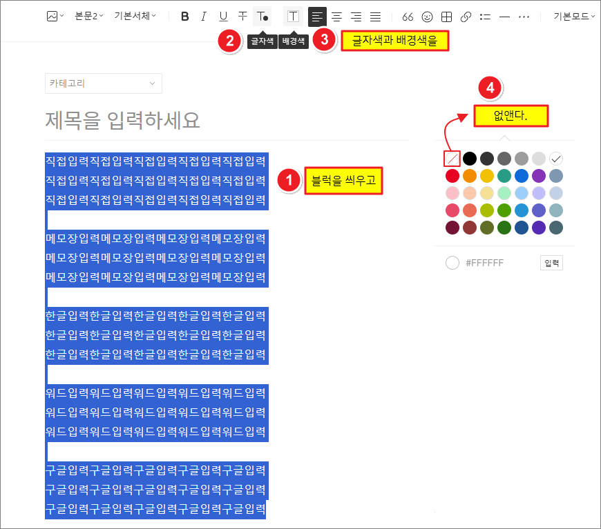 ① 아래 이미지와 같이 붙여넣기 한 텍스트에 블록을 씌우고 글자색과 배경색을 삭제하면 모든 쓸모없는 html 코드가 제거된다.